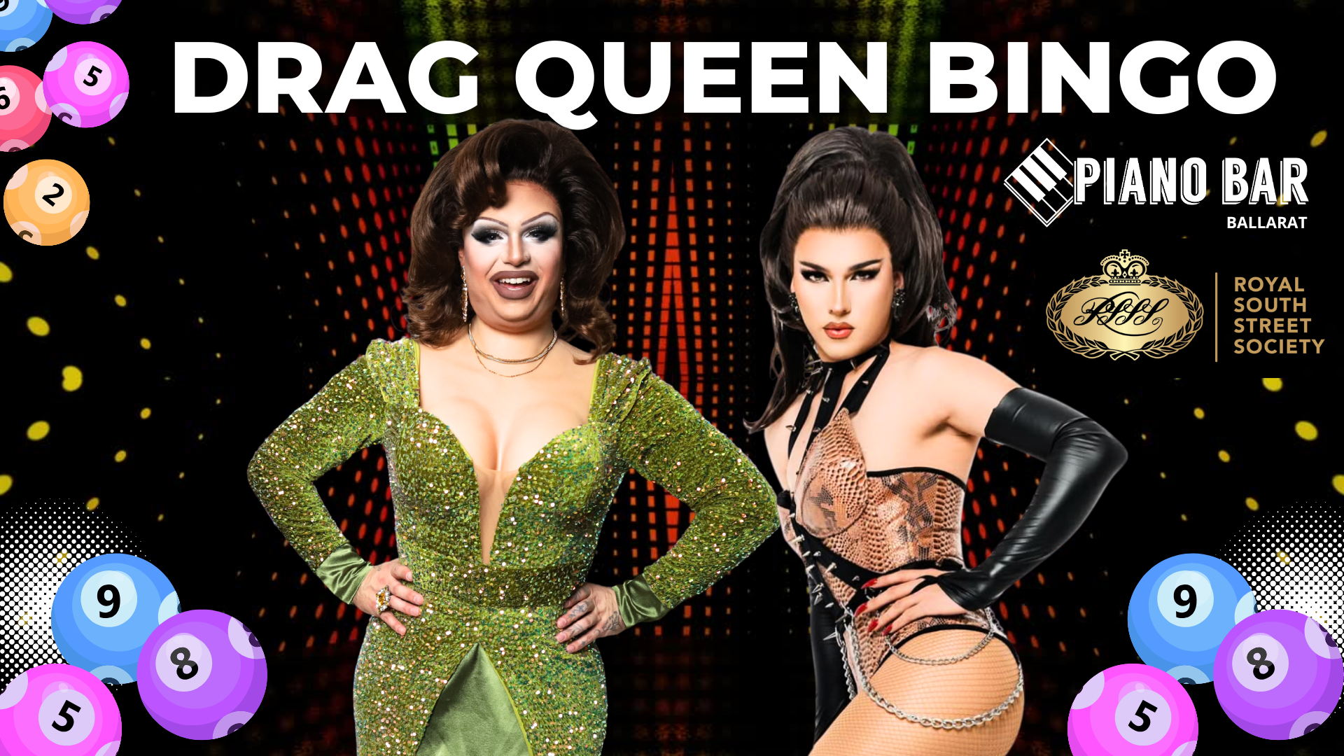 Join us for a night of Drag Bingo in support of the Royal South Street Society Ballarat Eisteddfod — Australia’s premier eisteddfod — as we raise vital funds to launch and support exciting new Vocal and Piano sections that will expand performance pathways and create greater opportunities for artists across the nation while continuing to promote participation, enjoyment and enrichment through all aspects of the performing arts.